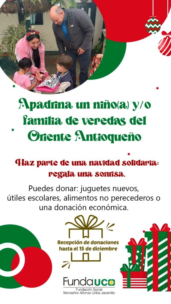 La Fundación FundaUCO inició su tradicional campaña de Navidad, una invitación a unirse para llevar alegría a los niños de las veredas del Oriente antioqueño y a comunidades de corregimientos como Aquitania y Puerto Venus. Esta iniciativa permite que cada niño reciba un regalo en esta época especial, gracias a la solidaridad de quienes deciden sumarse. Aquí puedes conocer el listado de niños y niñas y unirte a esta iniciativa